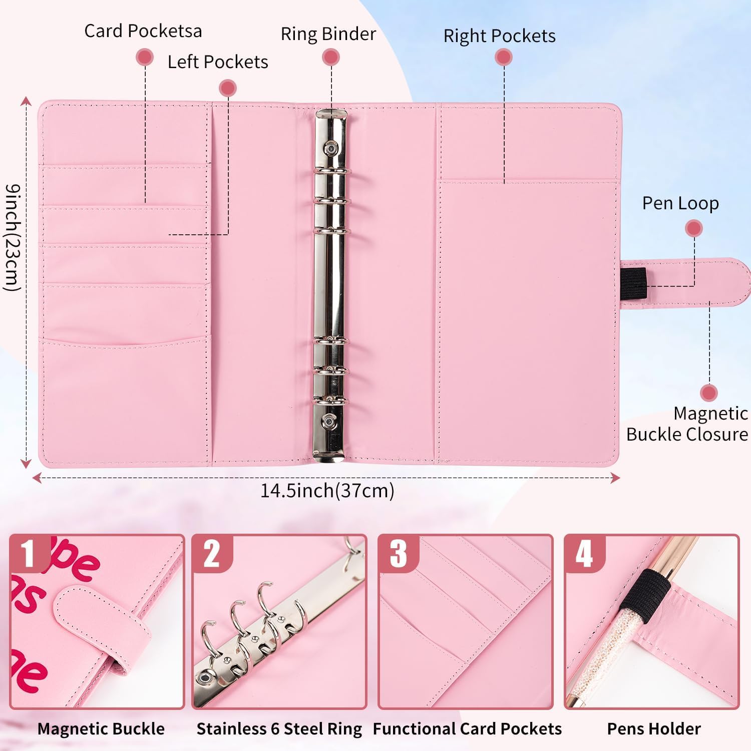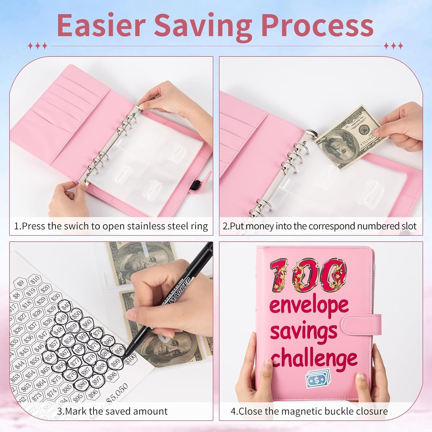 - Savings Challenge Binder: Comes with a PU leather A5 binder with a high-quality magnetic closure. Includes 2 reusable laminated trackers with denominations ranging from $1 to $100 and 25 pre-printed 1-100 6-hole cash envelopes.Effectively manage your finances using our savings book.