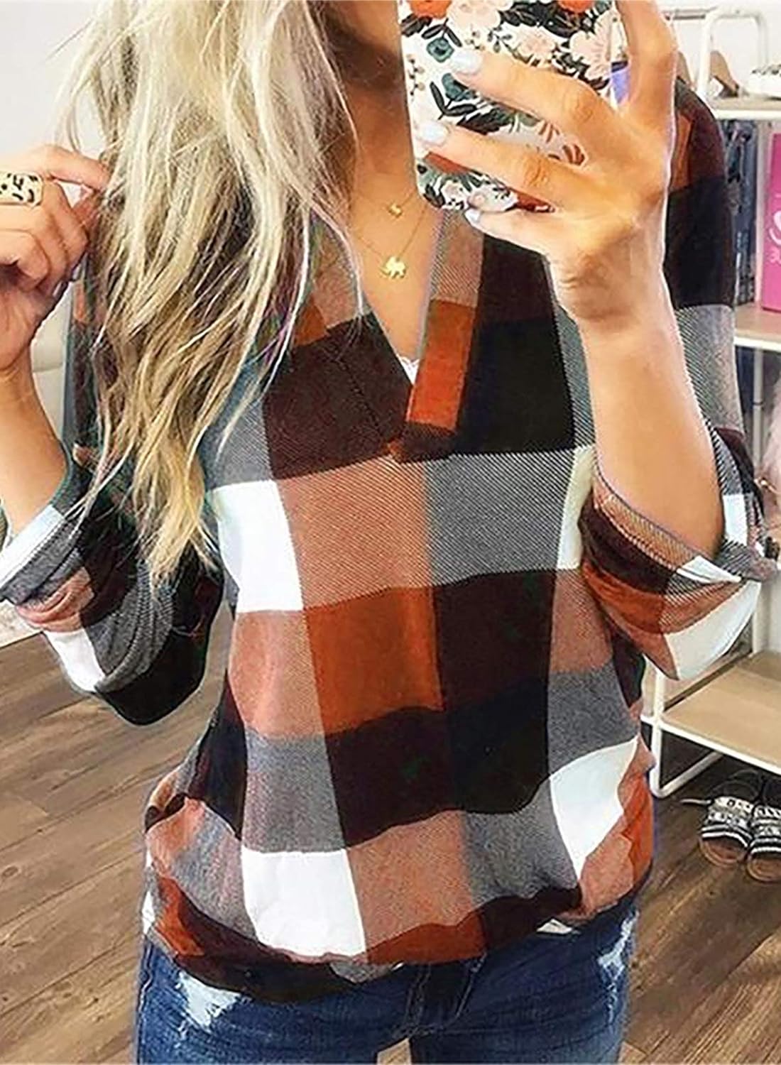 Product details Fabric type 95% Polyester, 5% Spandex Care instructions Line Dry, Do Not Bleach Origin Imported Closure type Pull On About this item If you are looking for a unique plaid shirt,that will be a wonderful chioce.This plaid shirt features a v-neckline, cute collar, a rounded hemline, and a trendy high-low cut design ,color block plaid for you to choose. You are going to fall in love with this adorable blouses!Great combine with lightweight material and loose fit style to ensure that you will be outstanding. This long sleeve women shirts are suitable for Skinny Jeans and Boots for a fabulous and trendy look! It is easy to go with any pants, jeans, leggings. Occasion:This beautiful color block shirt is a great choice for date, casual, daily life, work, vacation, outdoor, party, shopping,lounge,backyard,street.school. Wash Recommended With Cold Water/Do Not Bleach/Hang Or Line Dry/Wash with like colours,that will increase the durability of your clothesÂ