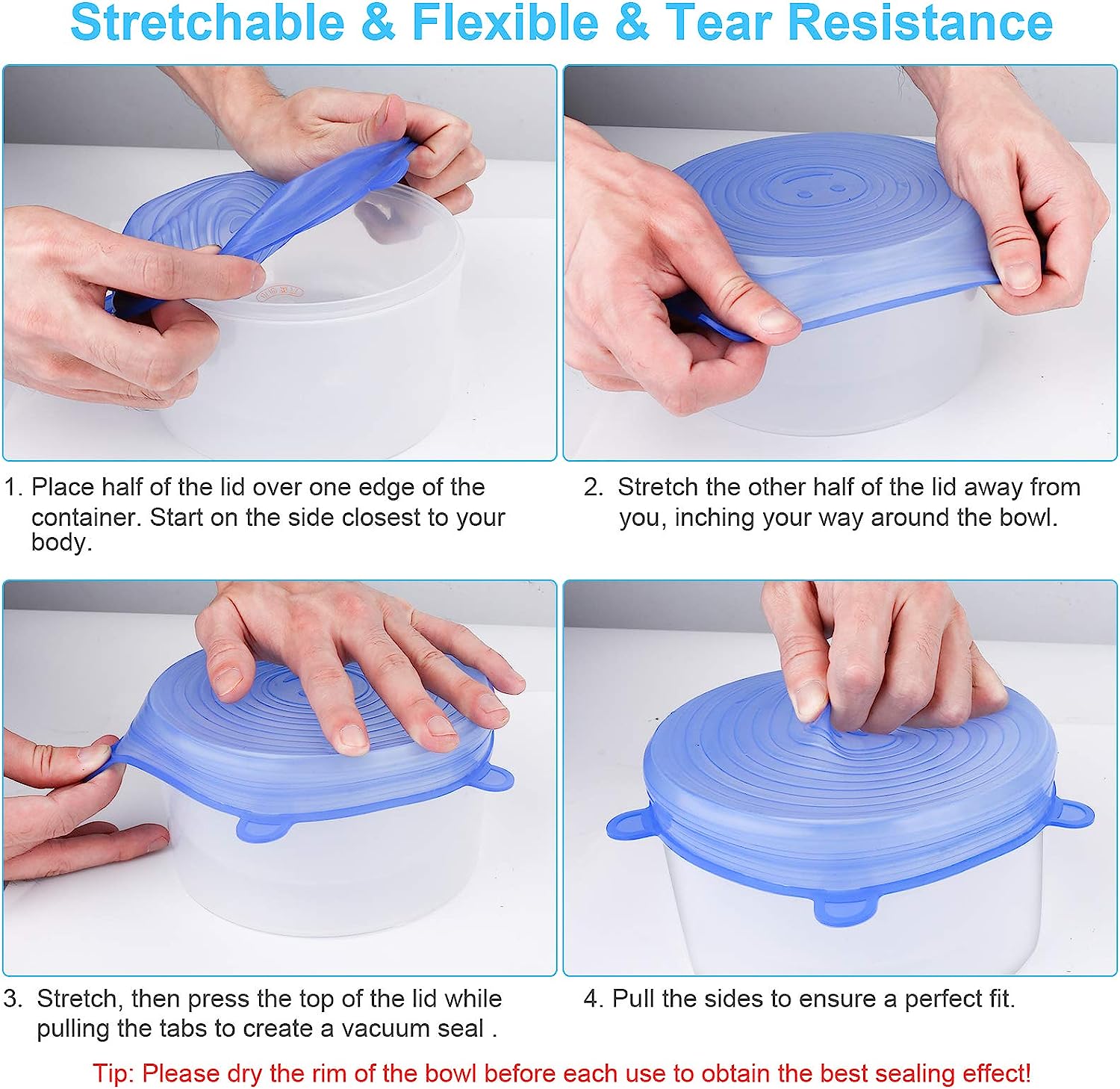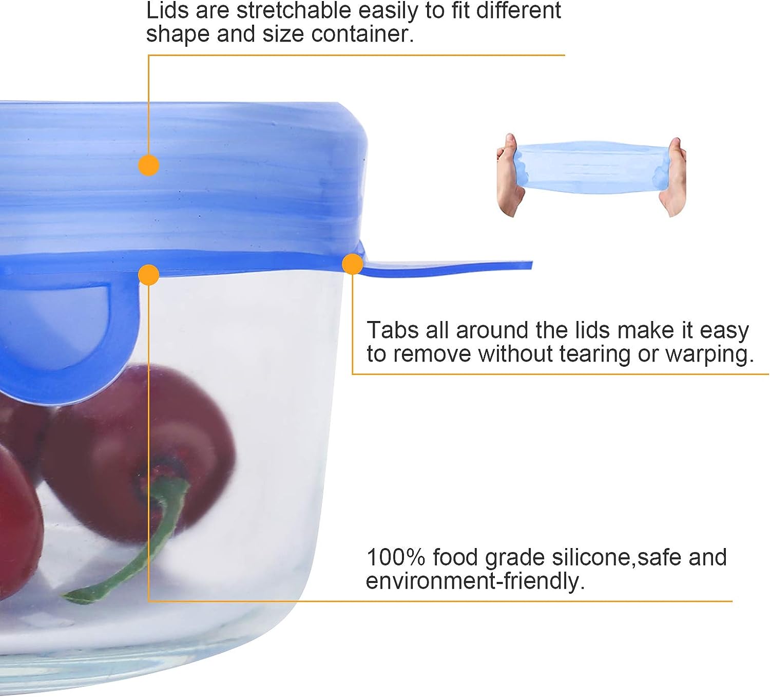 We focus on premium reusable silicone stretch lids! This flexible round silicone bowl cover can help you easily save refrigerator space and keep food fresh!We are aware of your needs and knowing you are long for better Stretch Silicone Lids for Food Storage! We hereby demonstrate reusable stretch and seal lids for you! Product Material:These silicone food covers are made of eco-friendly food grade silicone.Our silicone food covers are durable and will not tear or warp.Product Characteristics:These silicone lids are:Leak ProofStretch to Fit on any shape.Dishwasher SafeMicrowave SafeFreezer SafeFood SafeSuitable For A Variety Of Scenes:As long as the size is appropriate, it can be used.Such as a bowl, cups, glassware, pyrex, jar, food can, instant pot, crockpots, ect.No more hesitation! Try it now! 100% satisfaction guaranteed:Our team will be responsible for every customers and provide 100% satisfactory service. We are very confident in our silicone stretch lids. Please contact us if any issue or inquiry with our products, we will be very happy to solve the problem for you.Just Add To Your Cart Now!Package Includes:7 clear and 7 Blue round stretch silicone lids for food storage.2.6inch/6.6cm X 2, stretches to 4inch/10cm3.7inch/9.5cm X 2, stretches to 5inch/12.6cm4.6inch/11.7cm X 2, stretches to 6inch/15.1cm5.7inch/14.5cm X 2, stretches to 8inch/20cm6.5inch/16.5cm X 2, stretches to 9inch/22.8cm7.8inch/20cm X 2, stretches to 9.5inch/24cm9.8inch/25cm X 2, stretches to 12inch/30cm