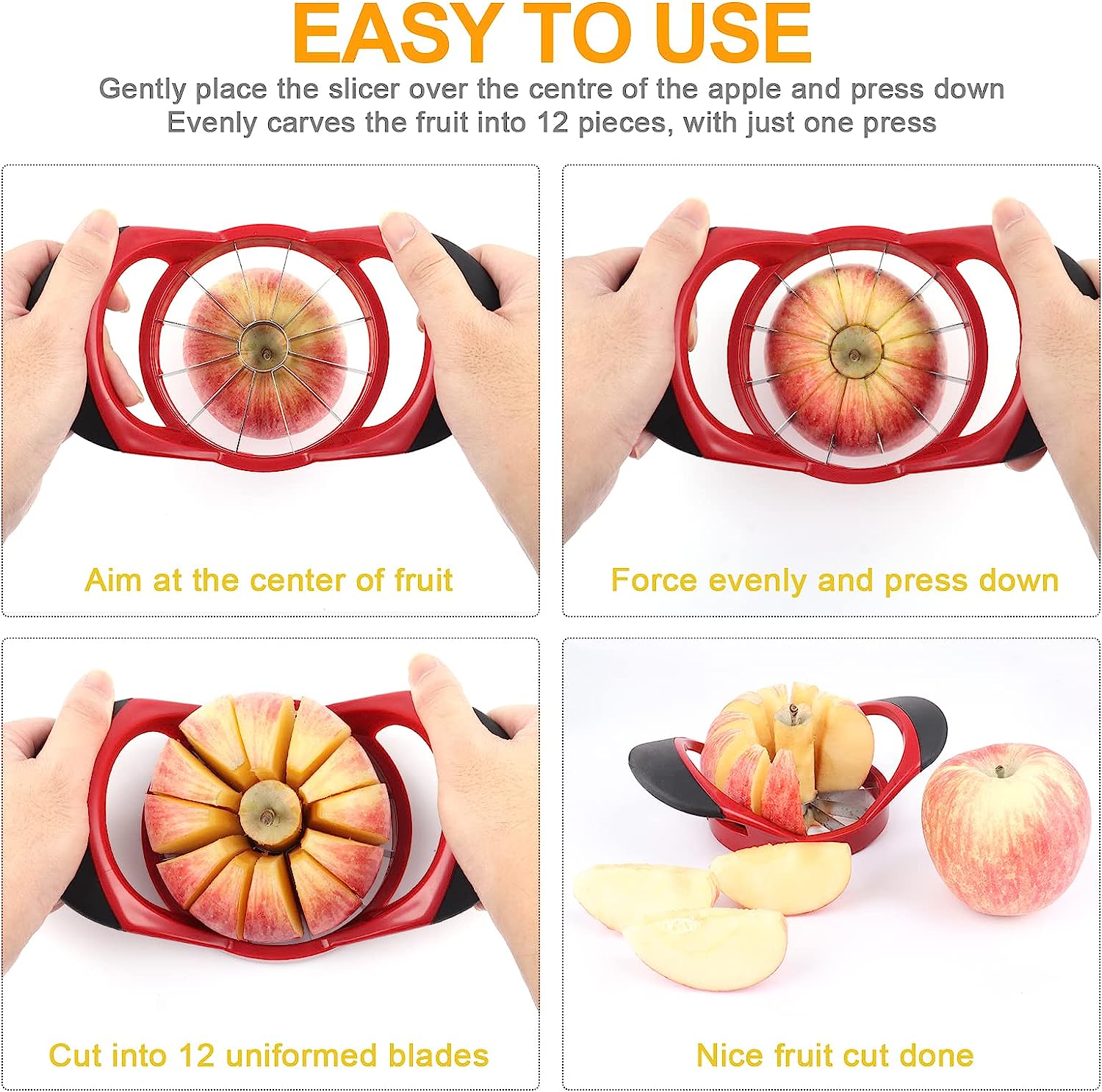 🧿【Easy to Use】Diameter up to 4.72 inches(12cm), suitable for most apple, pear, etc. Aim at the core, push down the slicer to core through it, slightly twist, and get rid of the core. Then you get 12 perfect apple slices right away! The ergonomic non-slip grip will help you cut with ease.