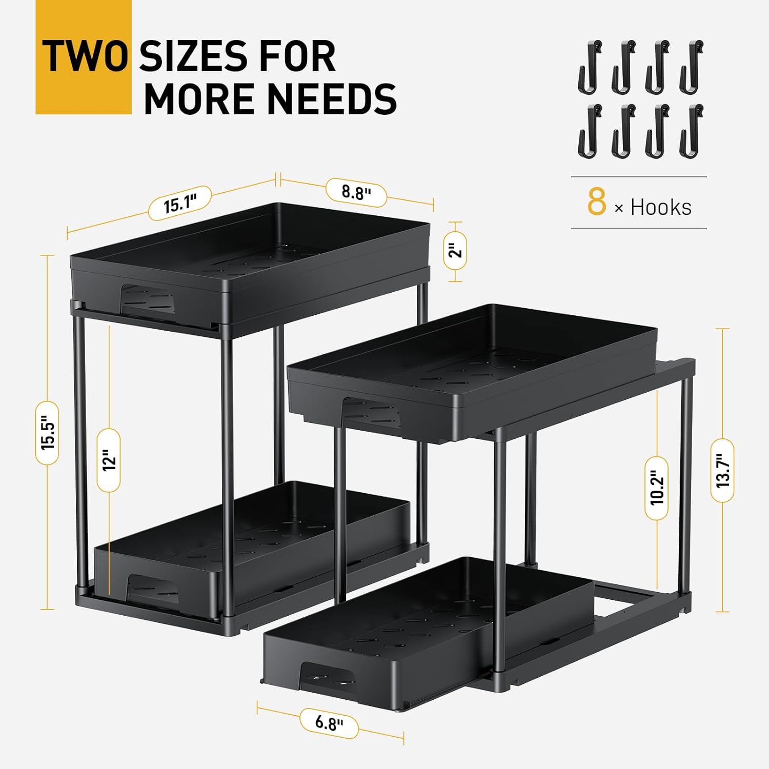 Under Sink Organizers and Storage, 2 Pack Pull Out Kitchen Bathroom Cabinet Organizer, 2 Tier Black Under Sink Storage for Bathroom Kitchen, Under Counter Storage Organizer with 8 Hooks