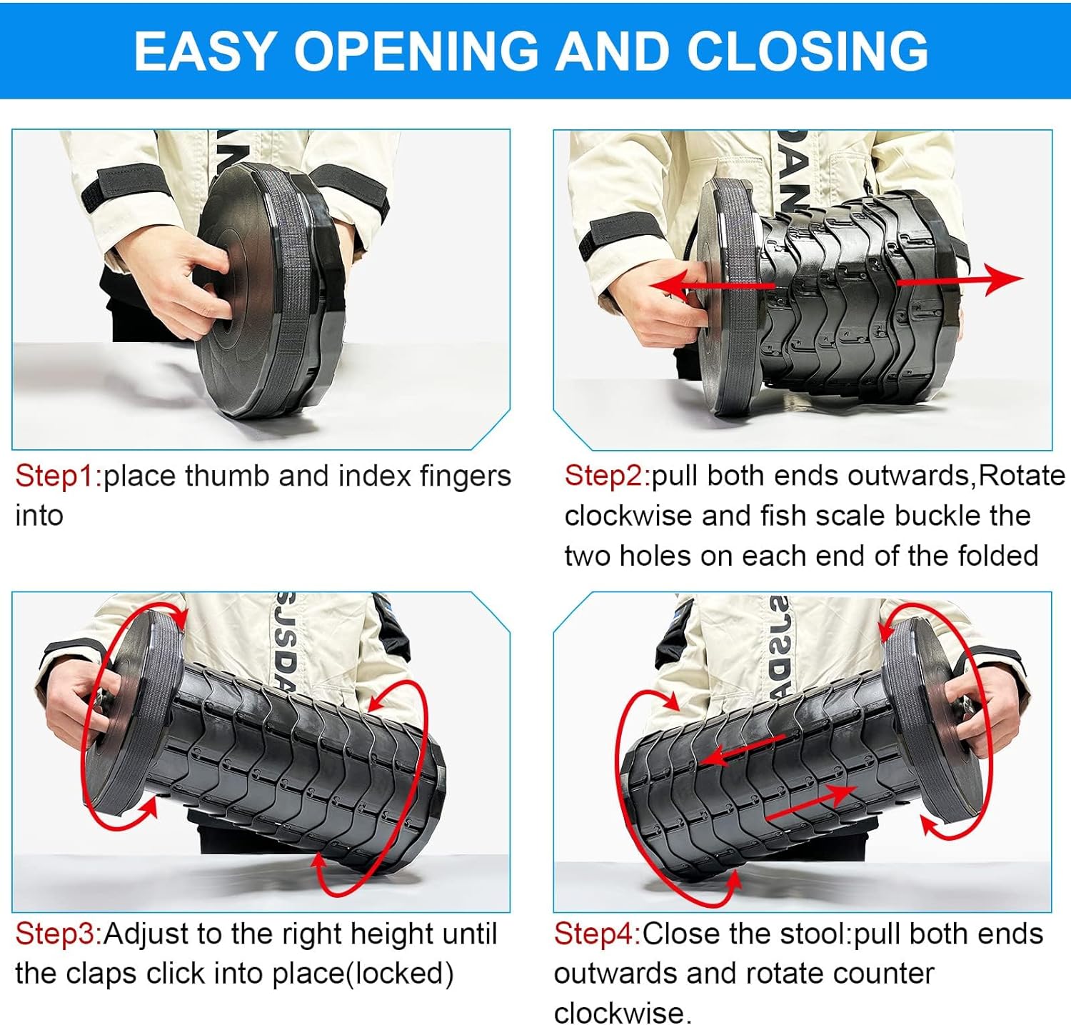 - 【Easy To Open And Use】The interior of this portable collapsible stool is designed with stiffeners to hold it in place, making the stool stronger and easier to open and close. The top and bottom of the collapsible stool are designed with two holes, you just need to hold the two holes, stretch and turn them clockwise/counterclockwise, and you can easily open and close them.
