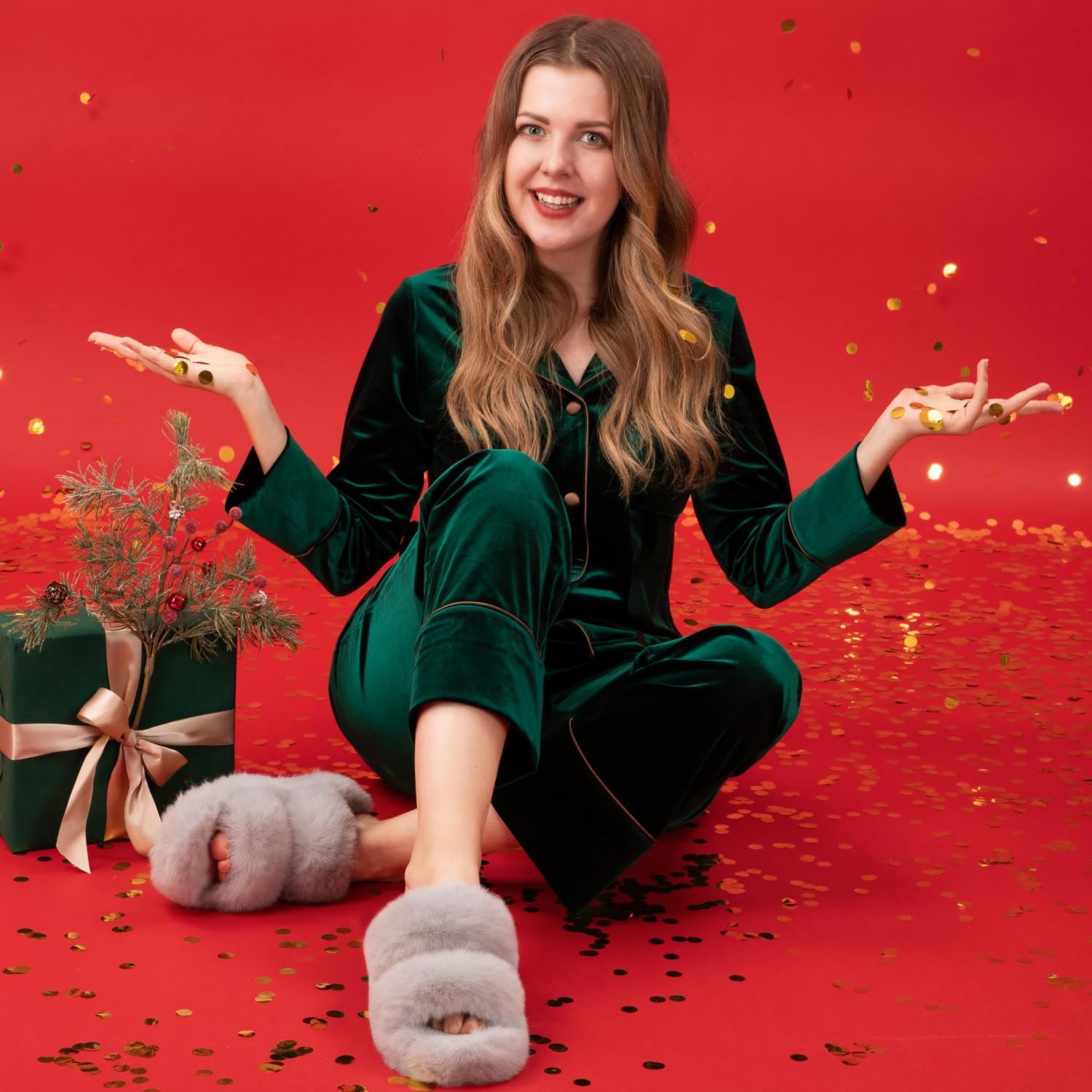 Women's Fluffy Faux Fur Slippers Comfy Open Toe Two Band Slides with Fleece Lining and Rubber Sole